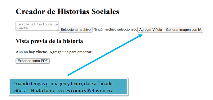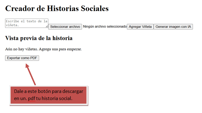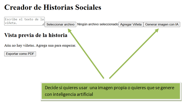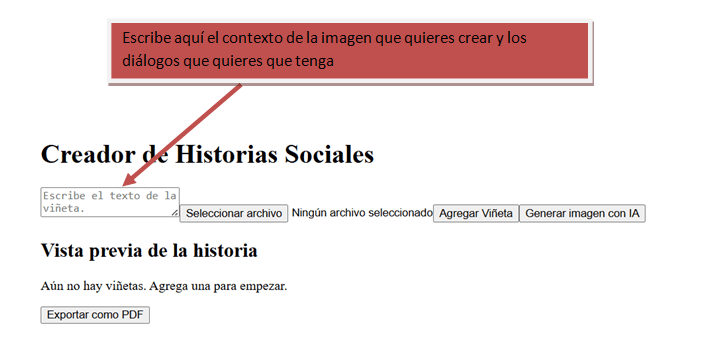 Con el objetivo de facilitar el aprendizaje de estas habilidades, hemos desarrollado una aplicación que permite generar Historias Sociales personalizadas. A través de una interfaz sencilla, los usuarios pueden escribir diferentes escenarios y nuestra herramienta generará automáticamente viñetas ilustrativas para cada historia. Esto permite visualizar la situación y comprender mejor las acciones y reacciones adecuadas en cada caso.
